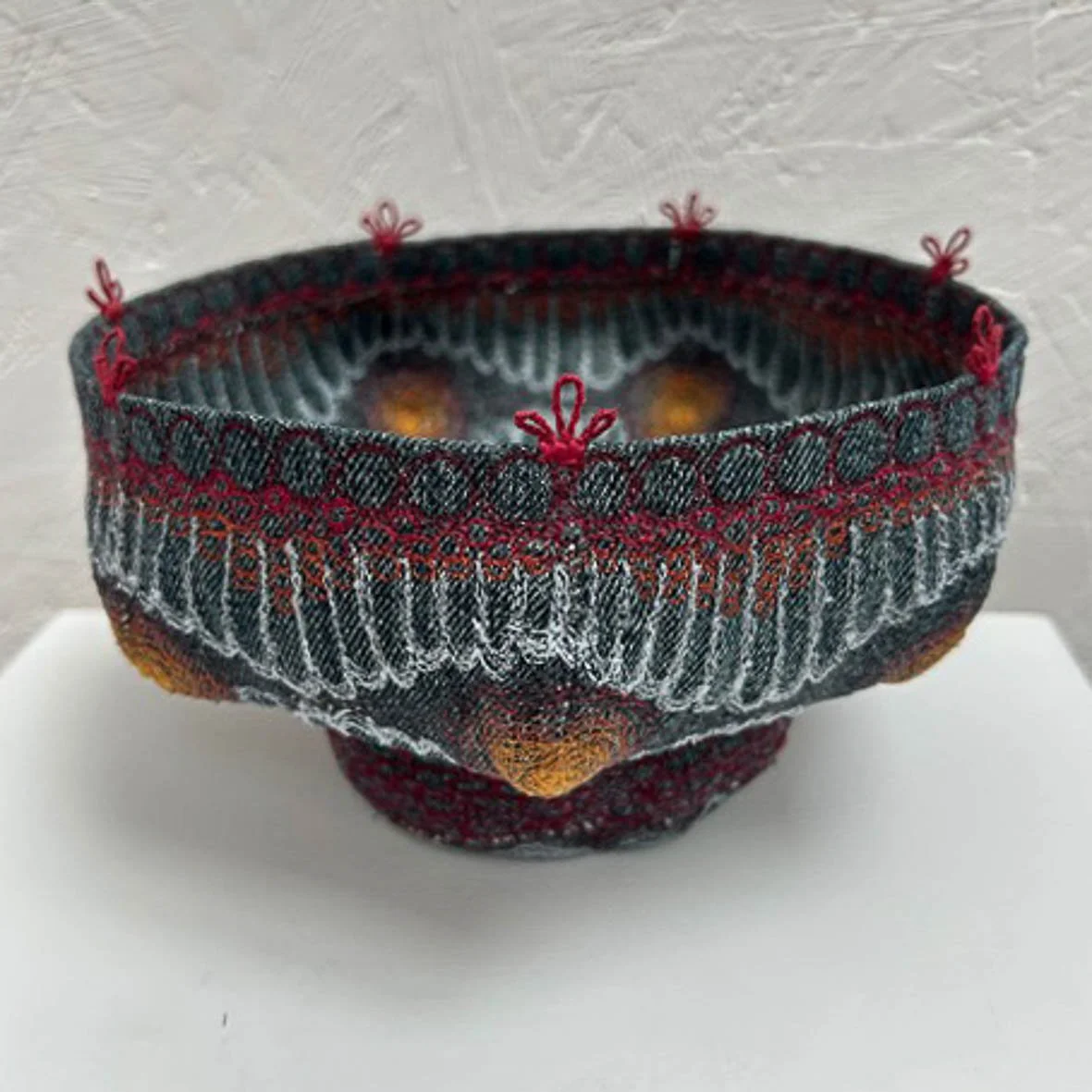 Responding to current issues she creates both 2D and 3D pieces and embellishes her work using machine embroidery and appliqué.